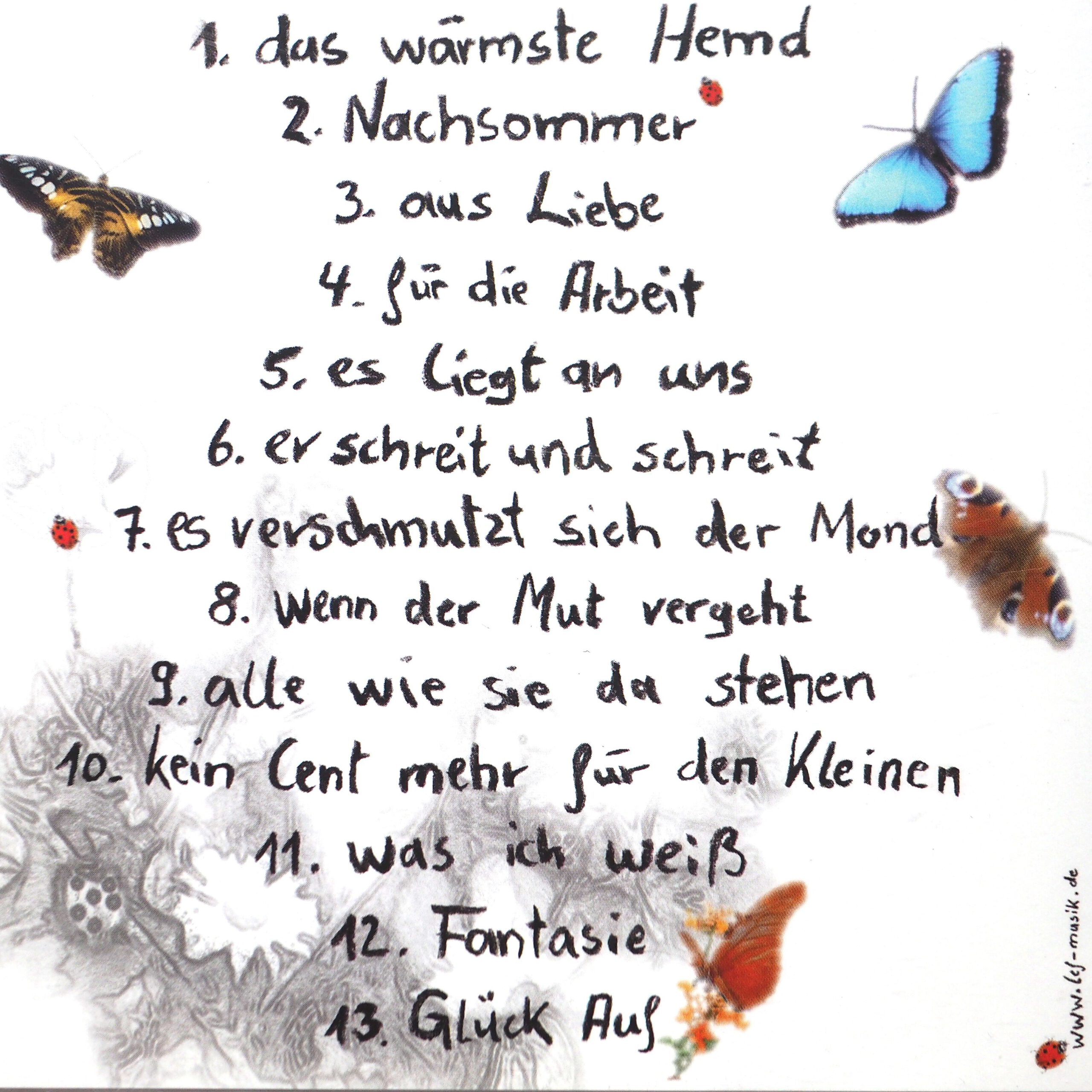 Hörproben das wärmste Hemd Nachsommer aus Liebe Für die Arbeit es liegt an Uns er schreit und schreit es verschmutzt sich der Mond wenn der Mut vergeht Alle wie sie da stehen kein Cent mehr für den Kleinen was ich weiß Fantasie Glück Auf (YouTubeLink)