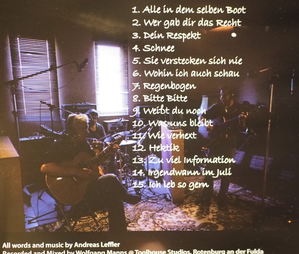 Alle im selben Boot (YouTubeLink) wer gab dir das Recht dein Respekt Schnee Sie verstecken sich nie wohin ich auch schau Regenbogen Bitte Bitte weißt du noch Was uns bleibt wie verhext Hektik zuviel Information irgendwann im Juli Ich leb so gern